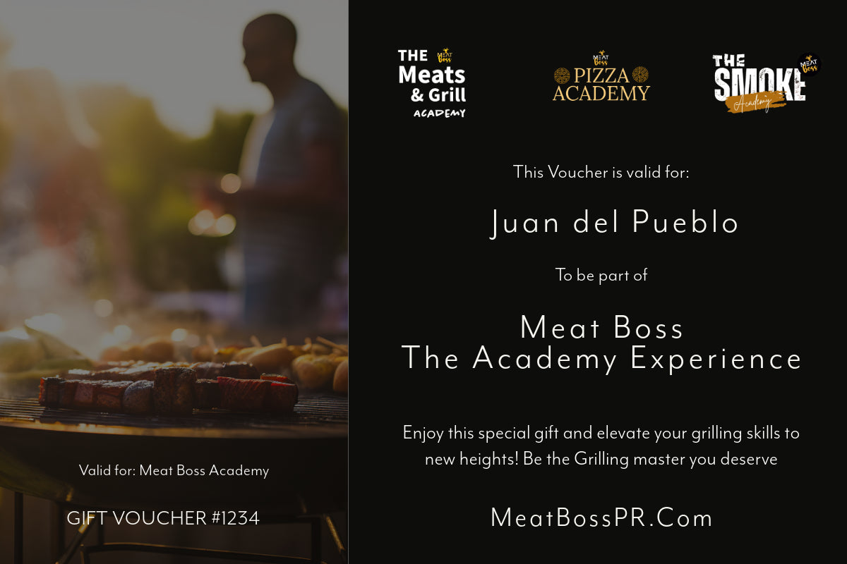 Sorprende a los amantes de la buena comida y la parrilla con un Gift Certificate válido para cualquiera de nuestras tres academias Meat Boss. Este certificado es el regalo perfecto para quienes disfrutan aprendiendo, cocinando, y llevando sus habilidades culinarias al siguiente nivel.